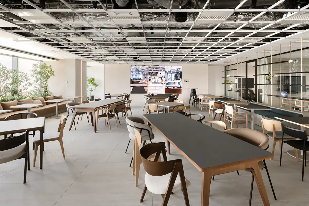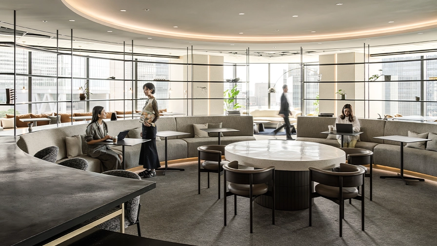 L字型のフロア形状の結節点に設けた、円形のシンボリックなエリア。シームレスで途切れのない「円」という形そのものが、多様な価値観やつながり、一体感を象徴し、テーマである「豊かさ」を発信しています。社員の活動やつながりを温かく包み込む場所として、イタリア語で「家、家庭、故郷」という意味をもつCASAをエリア名に採用しています。