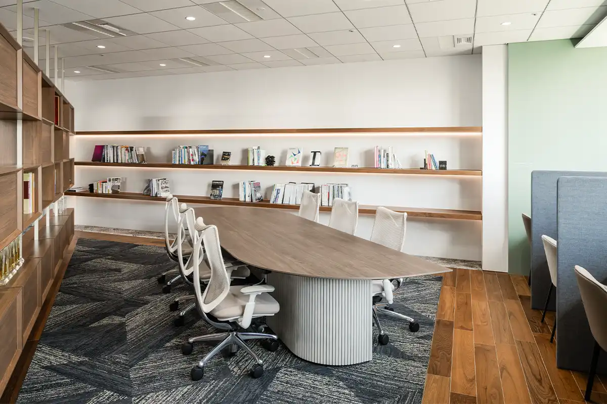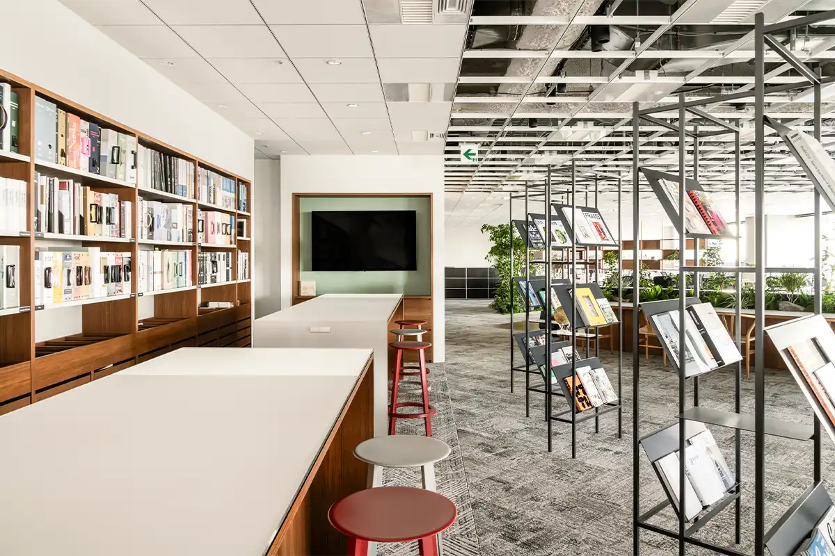 シェルフでゆるやかに仕切られたこのエリアは、フランス語で「本」という意味をもつLIVREと名付けました。本のページをめくるように流れる時間が自分を高める場所であってほしいという想いを込めています。実際に、図書館のように本を読む場所、知識を蓄える場所として、さらには集中して働くための場所としても活用できるような多機能なエリアです。
