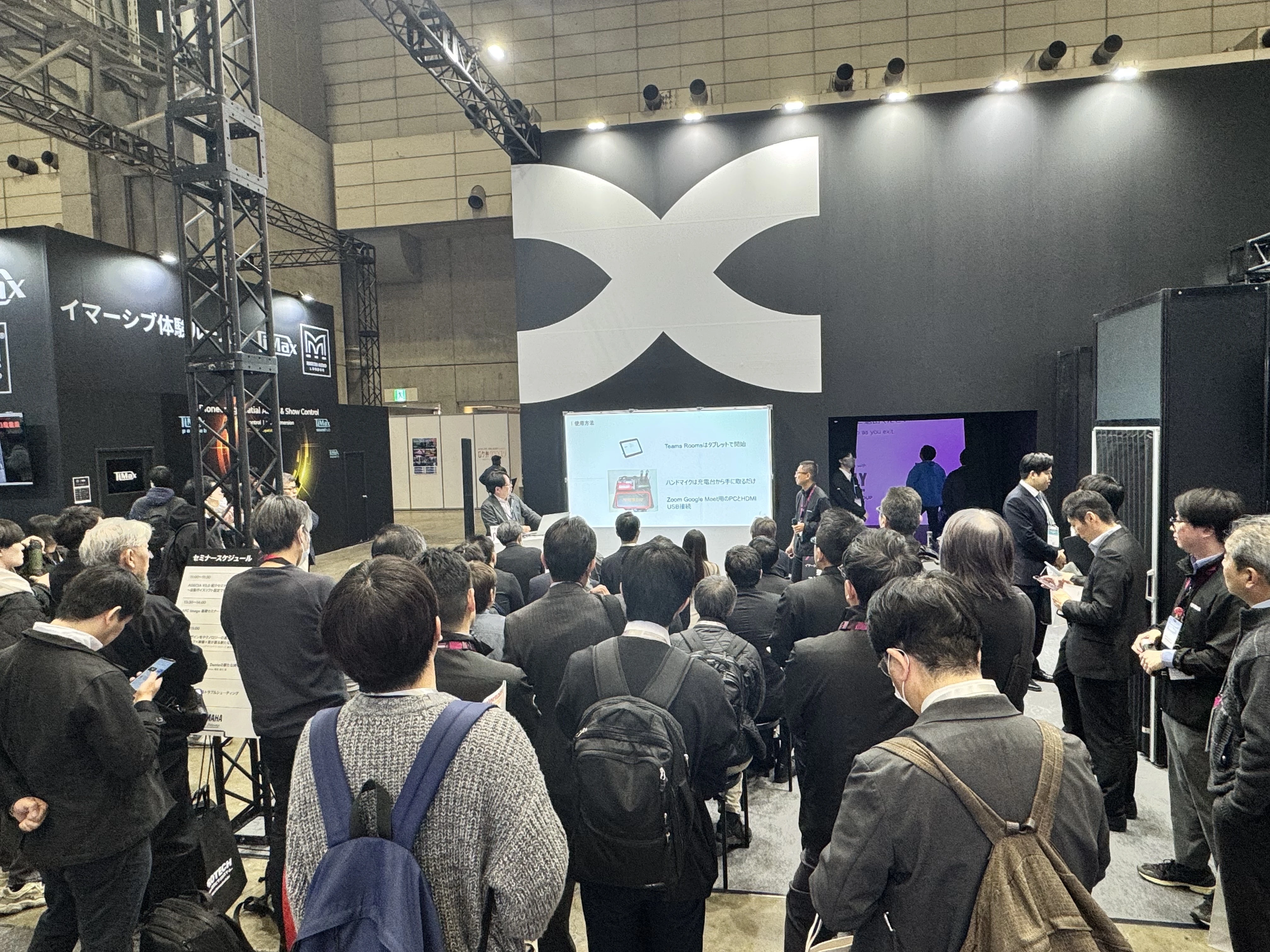 ヤマハミュージックジャパン様は今回、音響機器に加え、Dante・SDVoE・NDIなどのProAVプロトコルを活用した「AV over IP」ソリューションや、イマーシブオーディオ体験ルーム、会議ソリューション「ADECIA」シリーズなど、最新の音響・映像技術を幅広く展示されました。