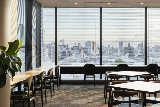 テラスのような開放感で窓の外とのつながりを感じるコワーキングスペース