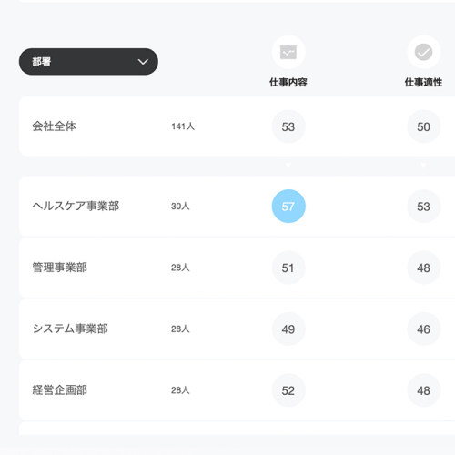 チーム別、男女別など多数の分析視点や他社の分析結果を含むサーベイ全体のデータから相対評価する偏差値機能。